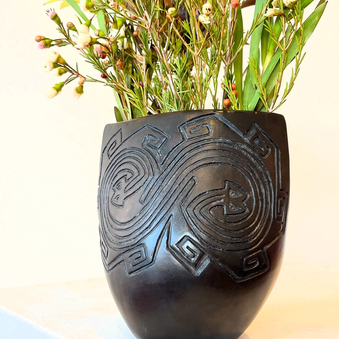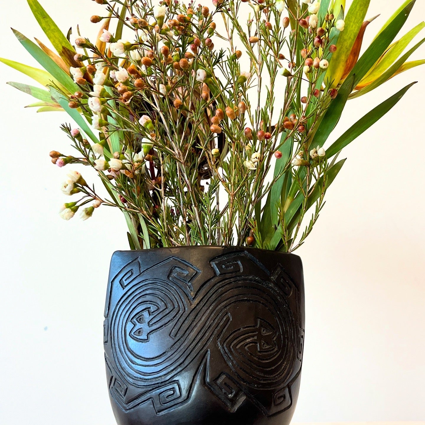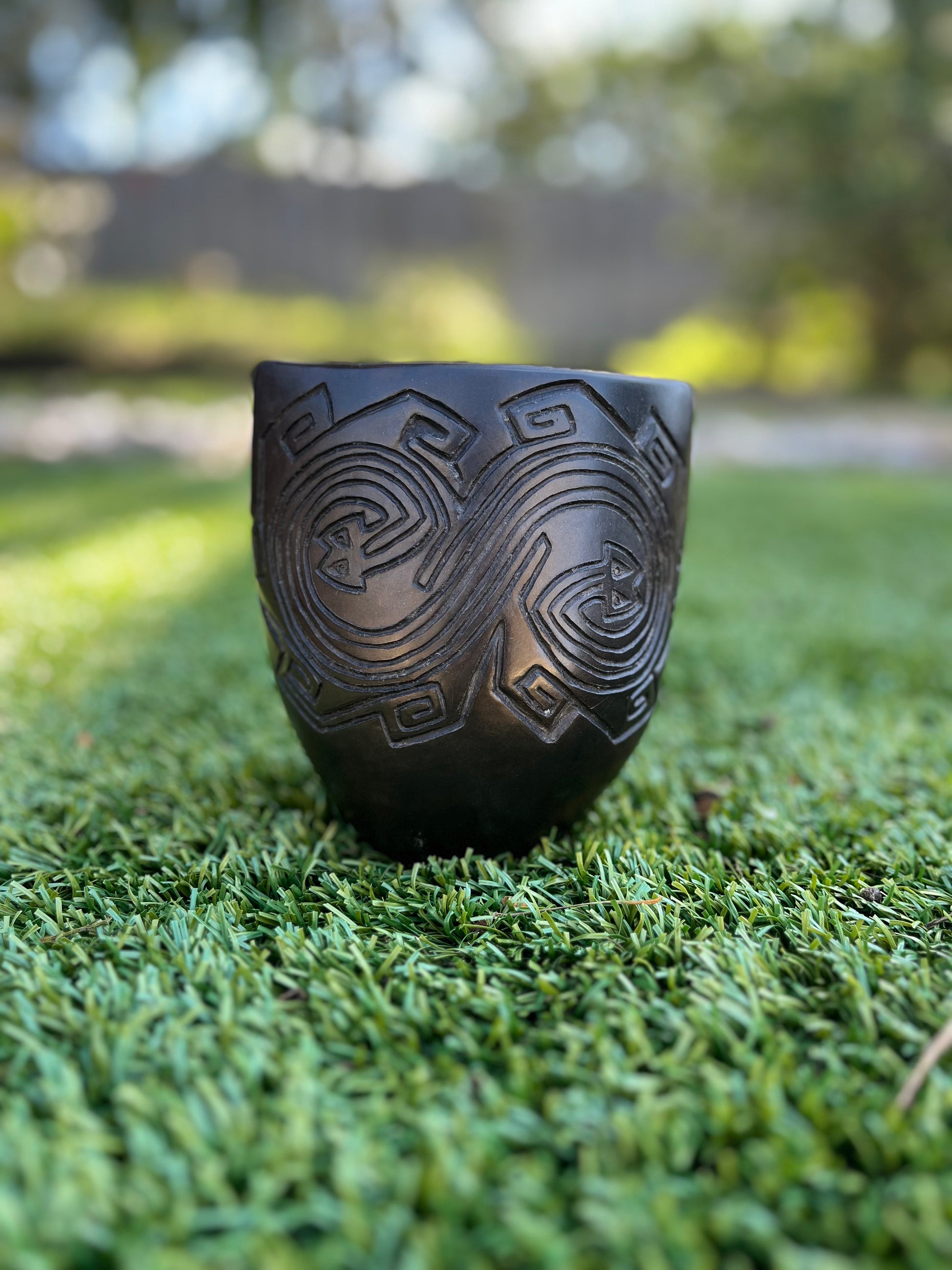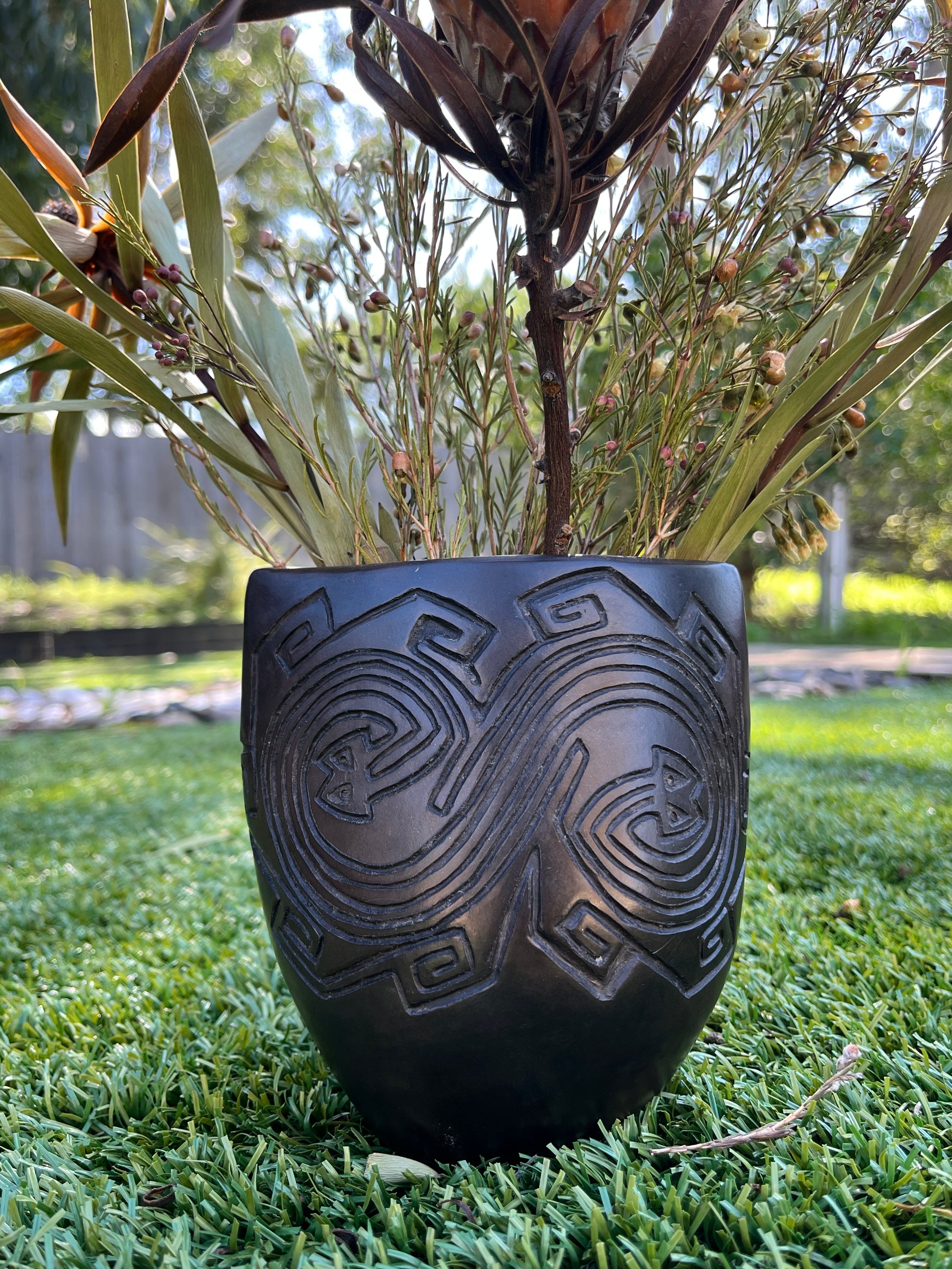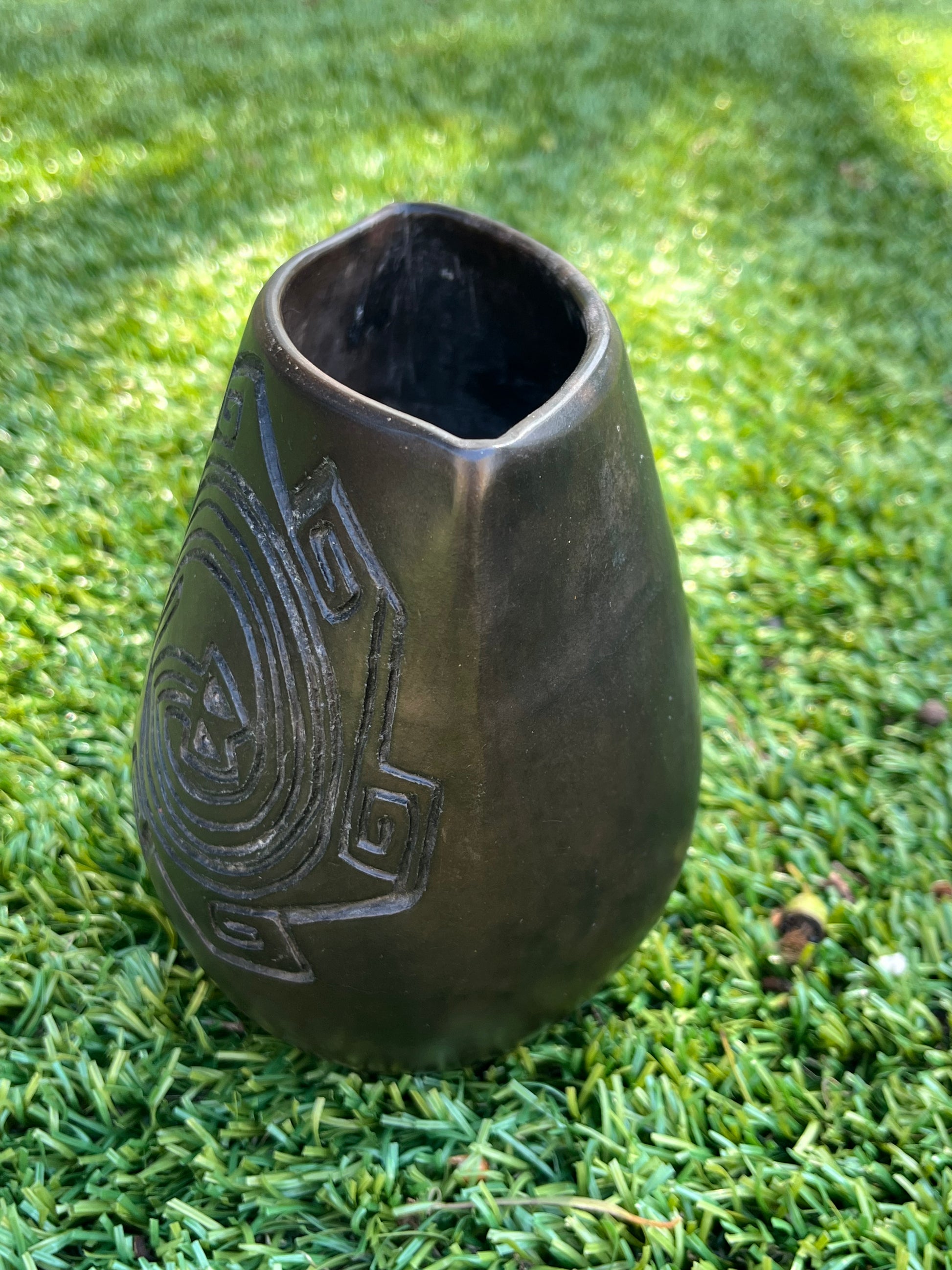 Terracota, burnished, wood fired, beeswaxed, polished.